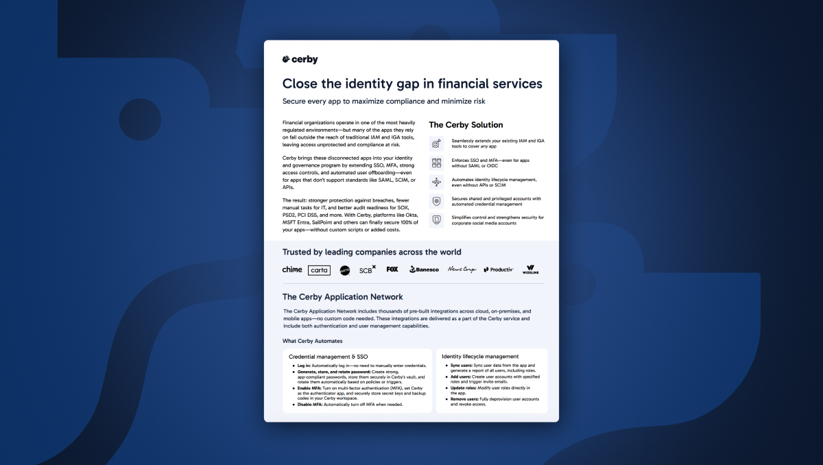 Financial services teams face complex security and compliance demands—but disconnected apps often fall outside traditional IAM and IGA tools. Cerby closes this identity gap by extending governance, MFA, and access controls to every app, even those without SAML, SCIM, or API support. The result? Stronger compliance, simplified audits, and complete coverage across your identity stack.