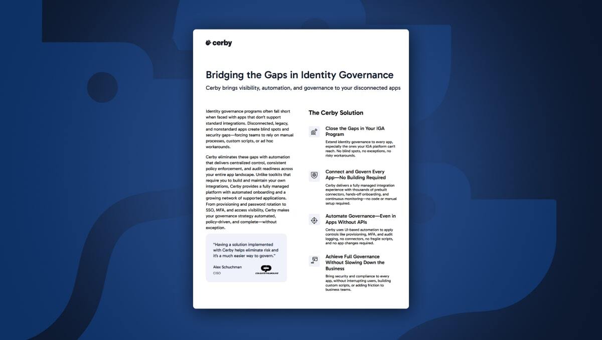 Cerby brings these apps into your governance framework. No custom connectors. No manual provisioning. Just complete lifecycle automation, consistent policy enforcement, and compliance oversight—at scale. Cerby integrates directly with your IGA platform to help you: